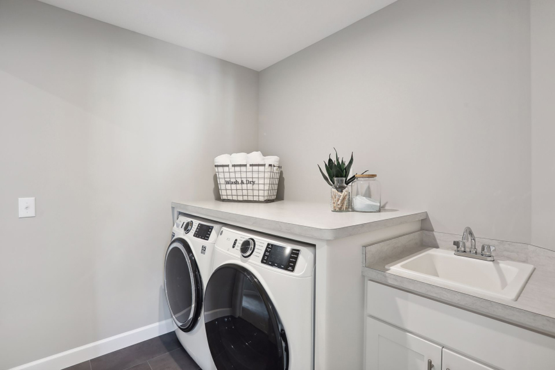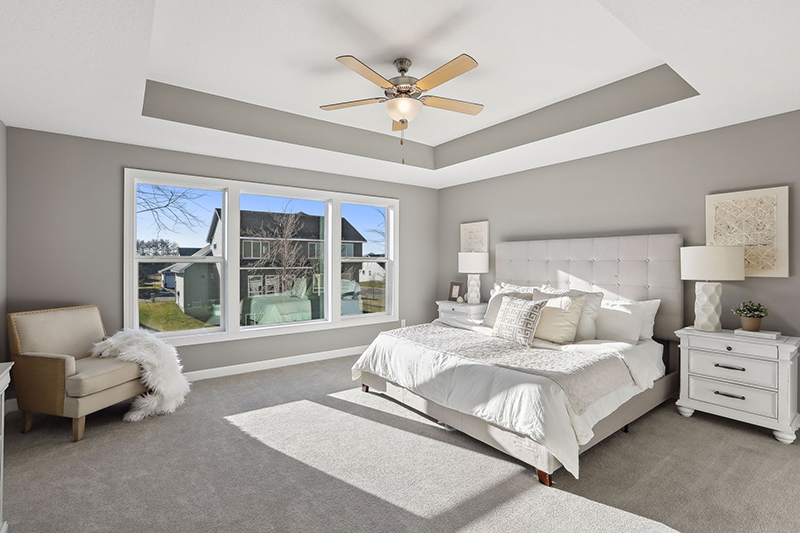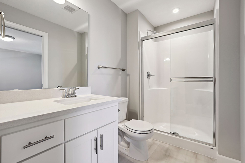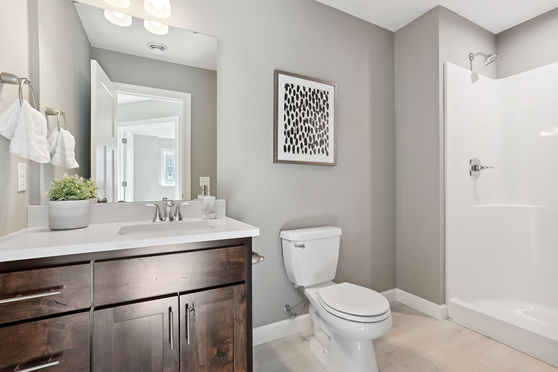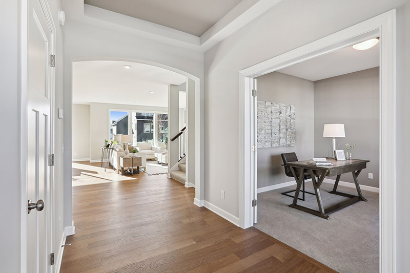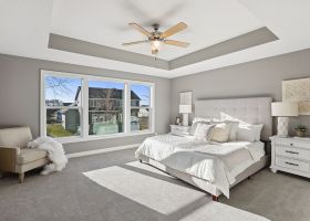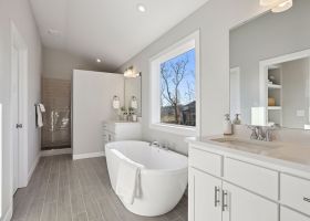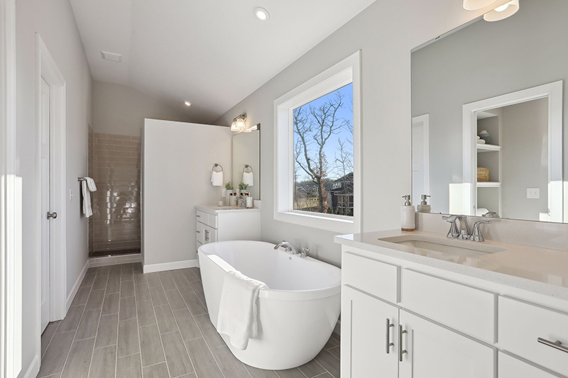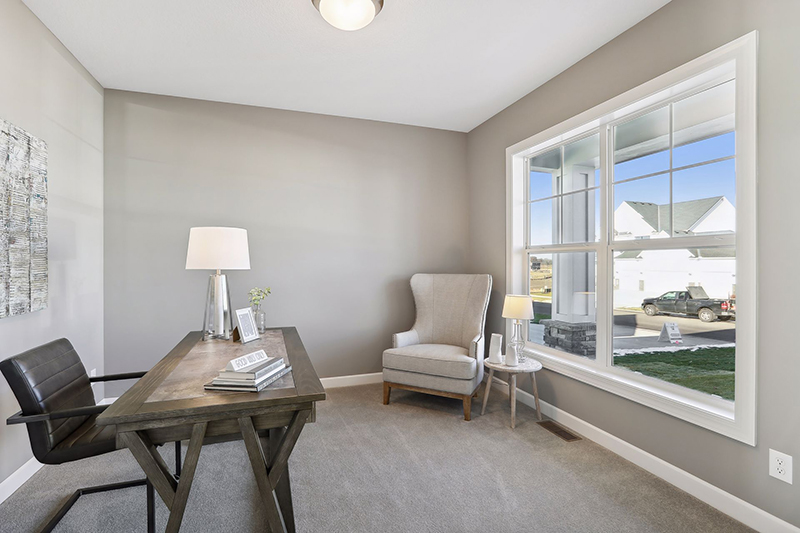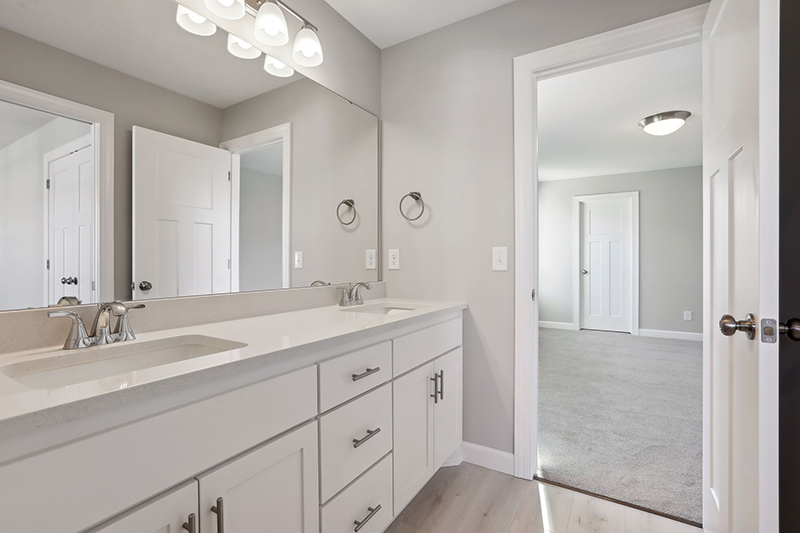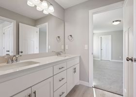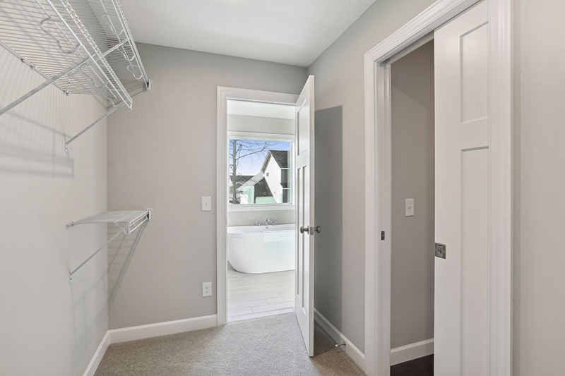 An open and functional main level with our signature flex room and great room with built-in entertainment center and stone fireplace. Upstairs features an Owner’s Suite complete with walk-in double-headed tile shower, freestanding soaker tub, separate toilet room, large walk-in closets. In addition, upstairs has large bedrooms with private baths, pass-through laundry and a hallway linen.