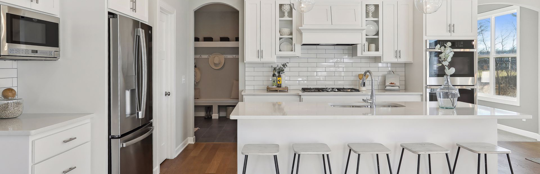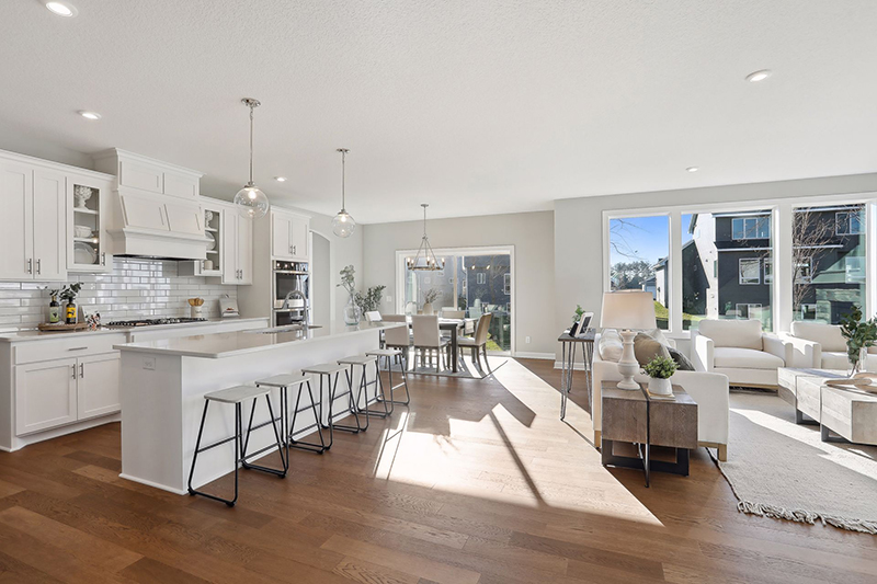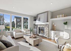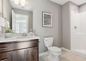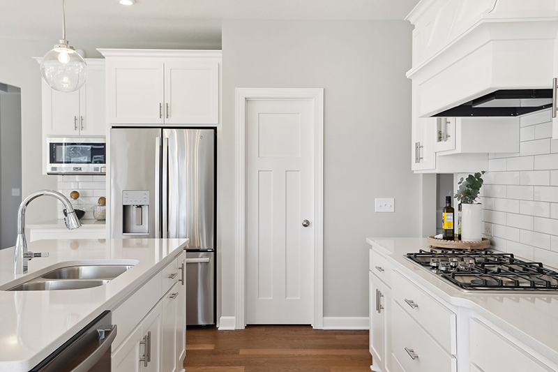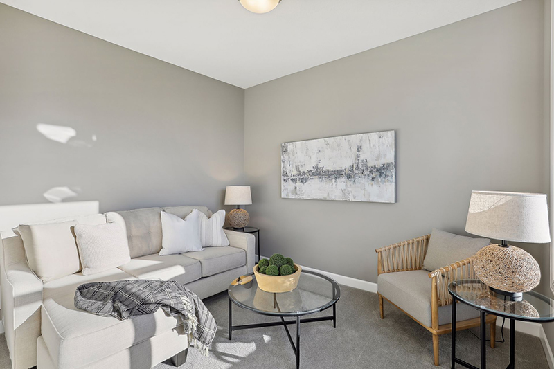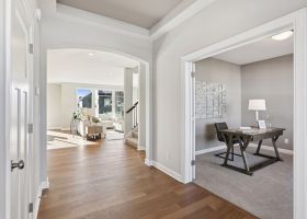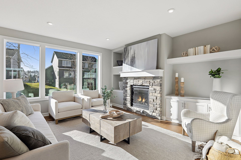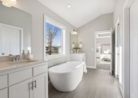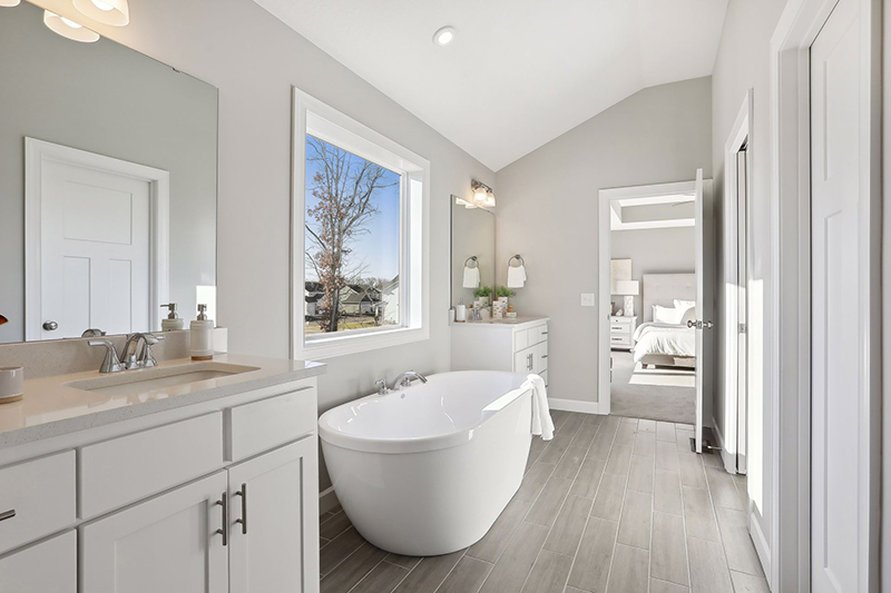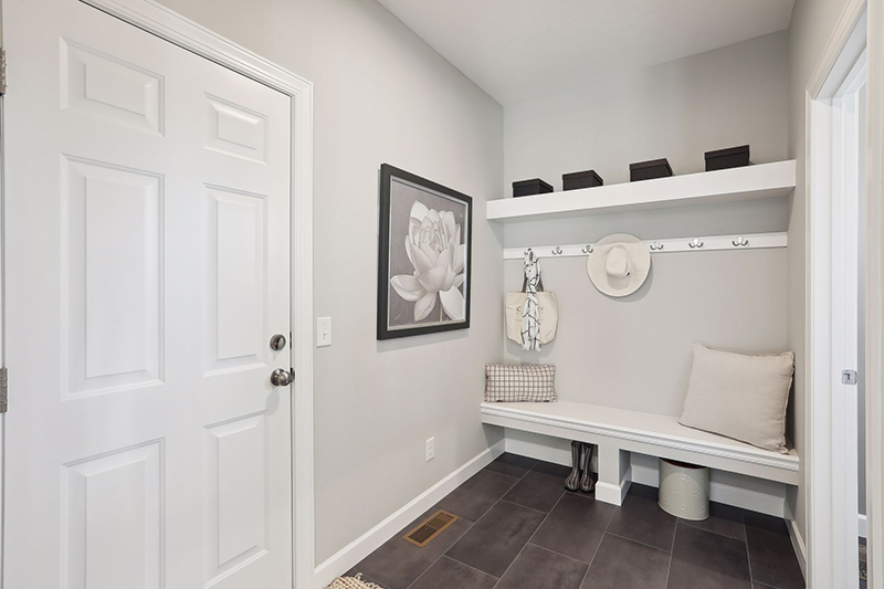 An open and functional main level with our signature flex room and great room with built-in entertainment center and stone fireplace. Upstairs features an Owner’s Suite complete with walk-in double-headed tile shower, freestanding soaker tub, separate toilet room, large walk-in closets. In addition, upstairs has large bedrooms with private baths, pass-through laundry and a hallway linen.
