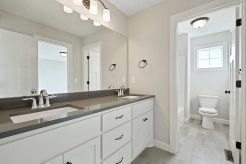 An open and functional main level with our signature flex room and great room with built-in entertainment center and stone fireplace. Upstairs features an Owner’s Suite complete with walk-in double-headed tile shower, freestanding soaker tub, separate toilet room, large walk-in closets. In addition, upstairs has large bedrooms with private baths, pass-through laundry and a hallway linen.